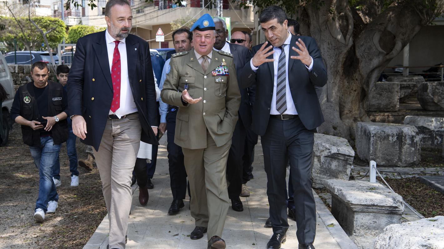 رئيس بعثة اليونيفيل اللواء ستيفانو ديل كول (وسط) مع السيد كارل فون هابسبورغ (يسار)، ورئيس الدرع الأزرق الدولية، والسيد سركيس خوري من المديرية العامة للآثار في لبنان، وذلك خلال منتدى "قبعة زرقاء ودرع أزرق" في صور في 5 نيسان 2019
