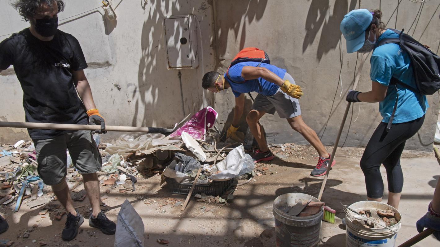 من خلال ارتداء الأقنعة والقبعات والقفازات وحمل أوعية الماء وأكياس الخيش والمجارف، قام موظفو الأمم المتحدة من مختلف الوكالات العاملة في جميع أنحاء البلاد بتفعيل مبادرة UN4Beirut# الأسبوع الماضي لتنظيف الشوارع التي دمرتها الانفجارات من الزجاج والركام ومساعدة المتضررين، وكذلك مساعدة السكان المصابينن بصدمات نفسية، محاولين جعل منازلهم صالحة للسكن مرة أخرى.