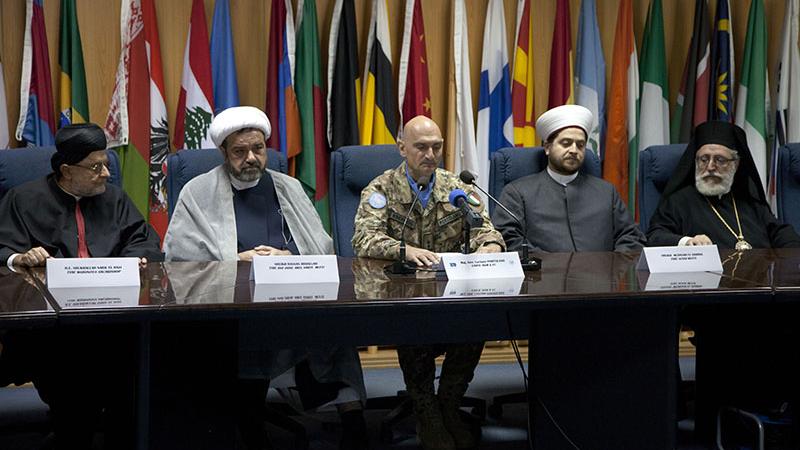 مسؤولون روحيون يشاركون في اللقاء مع السلطات المحلية في المقر العام لليونيفيل في الناقورة، جنوب لبنان.