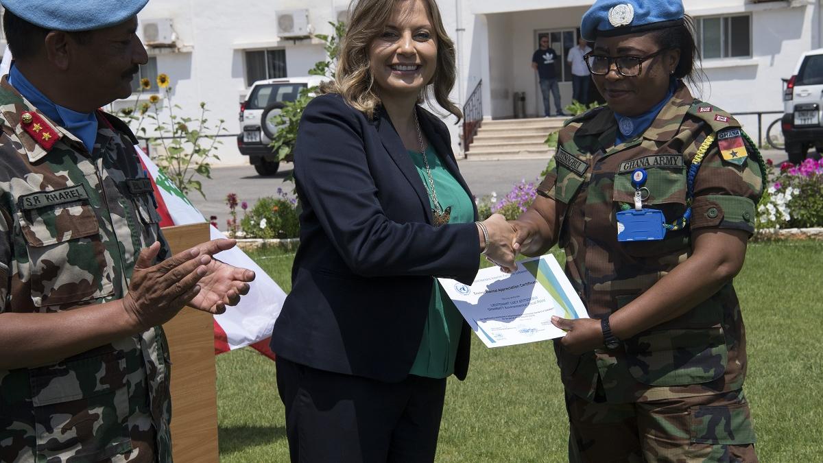 نائب القائد العام لليونيفيل اللواء شيفارام خاريل وكلودين عون روكز يسلمان شهادة تقدير الى الكتيبة الغانية التابعة لليونيفيل لإسهامها الكبير في الحفاظ على البيئة.