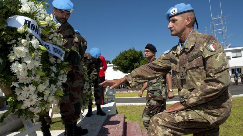 في مستهل الحفل، وضع رئيس بعثة اليونيفيل وقائدها العام اللواء باولو سيرّا، جنباً إلى جنب مع قائد قطاع جنوب الليطاني في الجيش اللبناني العميد جورج شريم ممثلاً قائد الجيش اللبناني، أكاليل الزهور على النصب التذكاري لليونيفيل تخليداً لذكرى جنود حفظ السلام الذين سقطوا في أثناء أداء واجبهم في جنوب لبنان.