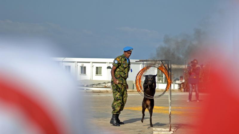كلب مدرب على الكشف عن المواد المتفجرة تابع للكتيبة السريلانكية في اليونيفيل يؤدي حركات بهلوانية خلال اليوم العالمي للتوعية من الألغام في المقرّ العام لليونيفيل في الناقورة.