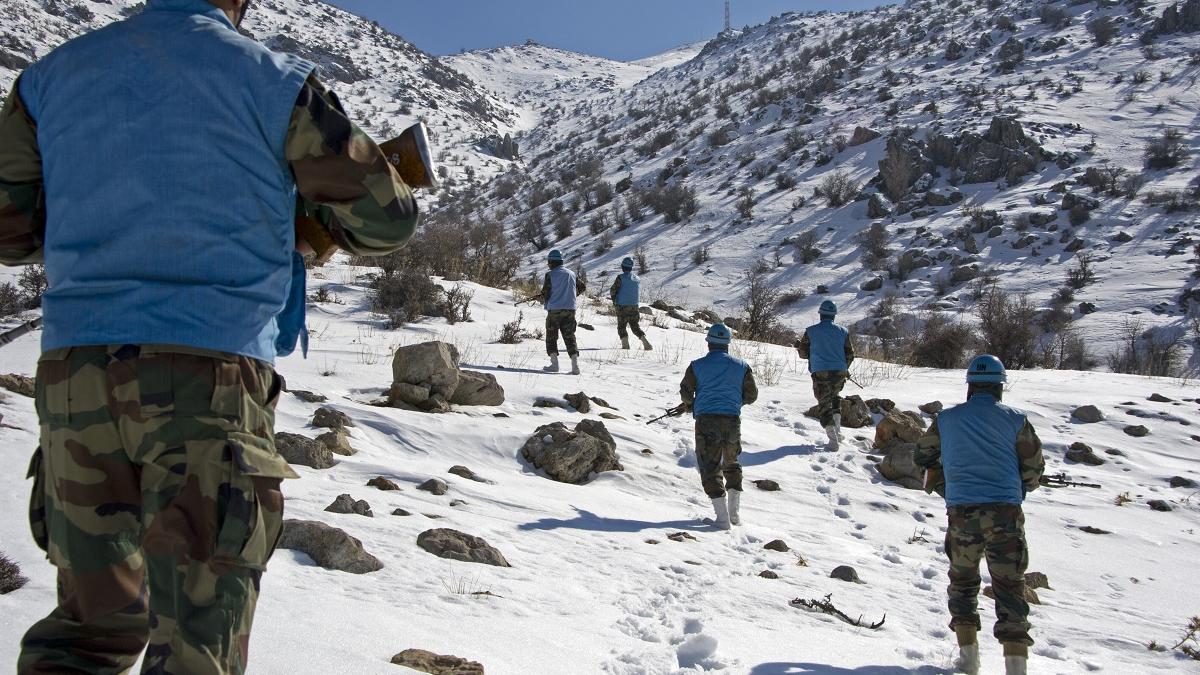 The crunch of snow under foot is a distinct sound. The team of UNIFIL Indian peacekeepers hike their way through the rugged terrain on a patrol near Shab’a. The recent cold snap has left blankets of deep snow, so the patrol had to park their vehicles at a lower position and proceed to the UN position on foot. The hike up the mountain is difficult but the peacekeepers proceed without complaint.