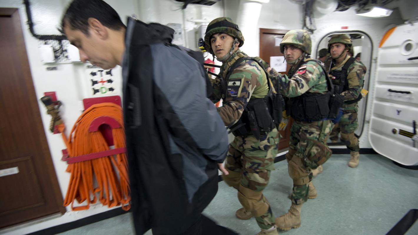 During the training exercise LAF Navy soldiers apprehend sailors of the intercepted boat.