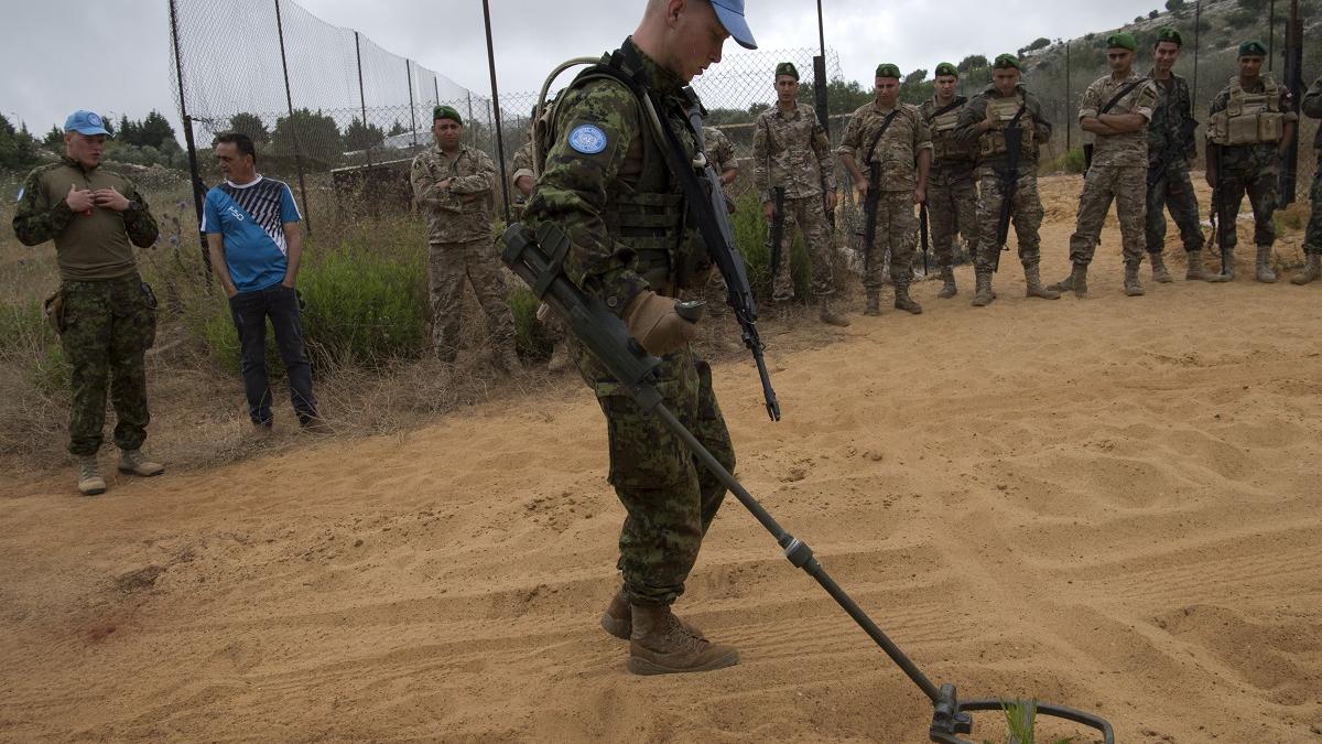The soldiers from the Lebanese Armed Forces (LAF) watch intently as a small unit of UNIFIL Estonian peacekeepers demonstrates the systematic technique to scan for improvised explosive devices (IEDs) while on patrol. The peacekeepers carefully scan the perimeter of a parked vehicle using metal detectors, and use spray-paint to mark the cleared area. Following this the LAF soldiers repeat the exercise.