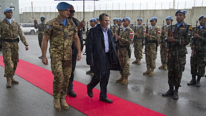 Lebanese Minister of Foreign Affairs and Emigrants Gebran Bassil and UNIFIL Head of Mission and Force Commander Major-General Luciano Portolano inspecting the guard of honor.