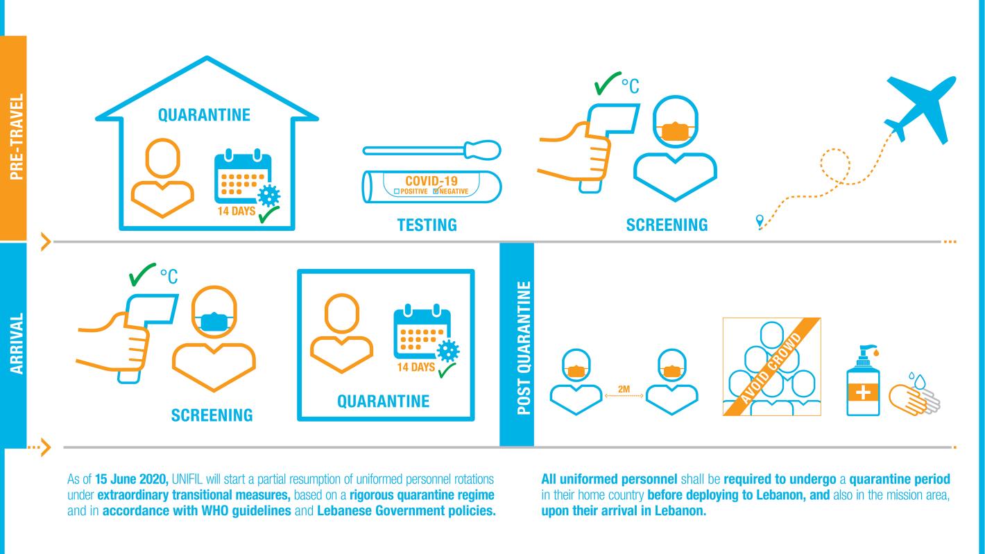 Consistent with the precautionary measures required by WHO health guidelines, during the rotation period all uniformed personnel shall be required to undergo a quarantine period in their home country before deploying to Lebanon, and also in the mission area, upon their arrival in Lebanon.