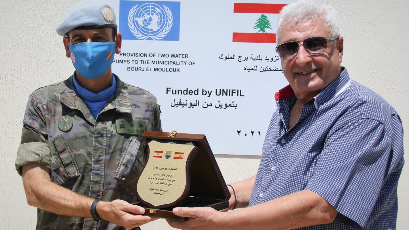 Similarly, at a separate ceremony in Bourj Al Malouke on 7 July, UNIFIL Spanish Battalion Commander Lieutenant Colonel Pérez Montes handed over two water pumps for the local water reservoir to Mayor Elias Ncoula Seleiman.