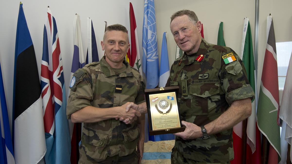 UNIFIL Head of Mission and Force Commander Major General Michael Beary today honoured a French peacekeeper for the latter’s recent endurance run for 24 hours around the Mission Headquarters.