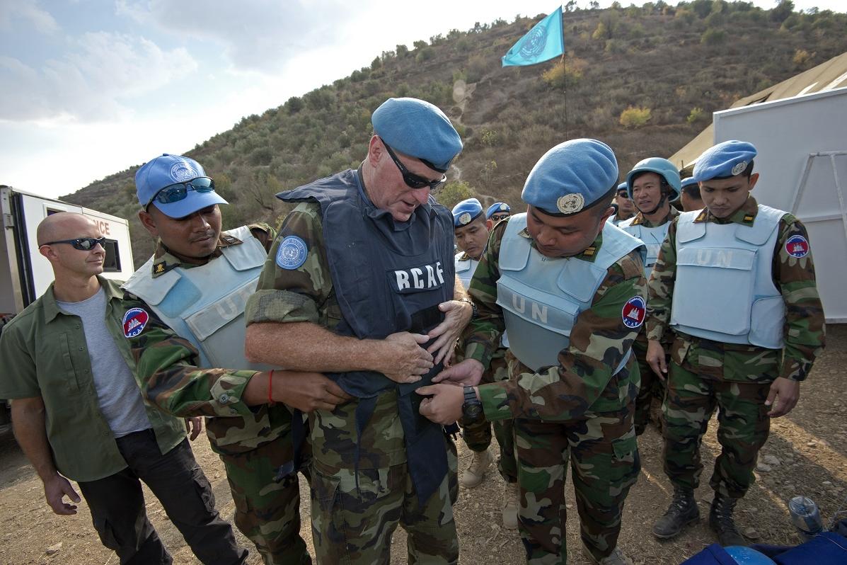 The demined path to one of the most recently agreed Blue Line points in Blida, south Lebanon, is wide and clearly marked. Even so, UNIFIL’s Head of Mission and Force Commander, Major-General Michael Beary, must wear a…